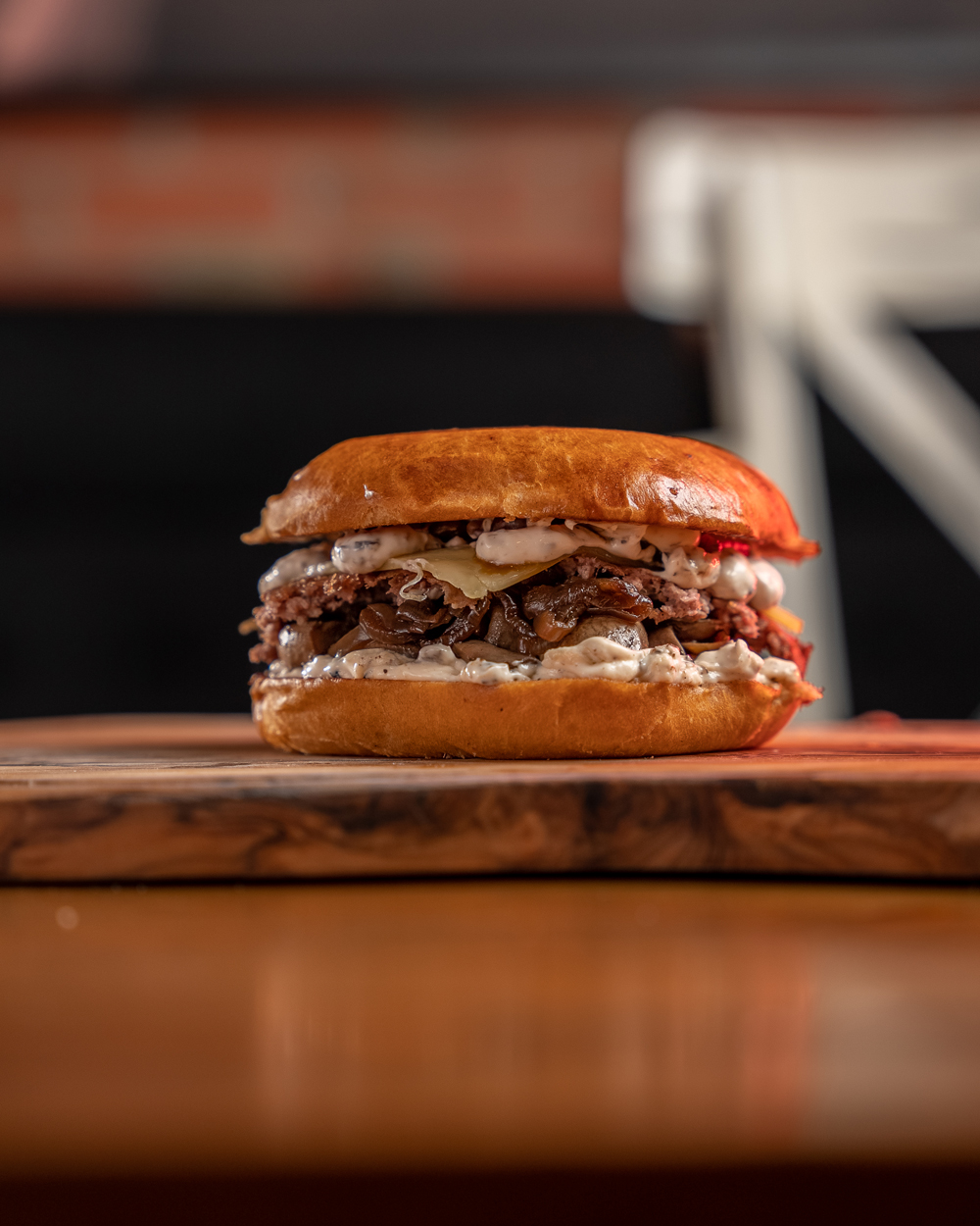 Bun brioché, Steak haché, Emmental, Champignons de Paris, Oignons grillés et sauce Mayo truffée.