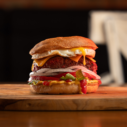 Bun brioché, Steak haché 250gr, Cheddar, Œuf à cheval, Tomate, Laitue, Oignon cru, Ketchup et Moutarde américaine